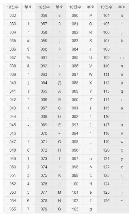32~127번까지 10진수와 부호의 짝을 정리한 아스키코드 표를 첨부한다. 내가 만든 것은 아니다. 나무위키에서 가지고 온 표이다.