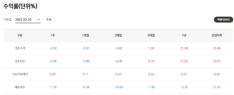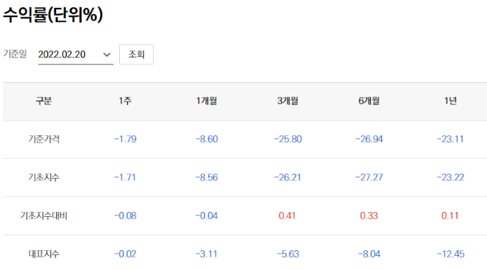 TIGER 소프트웨어 ETF 수익률을 보시면 1년 전에 비해 20% 넘게 하락한 가격임을 알 수 있습니다.