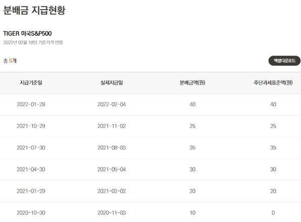 그리고 TIGER 미국 S&P 500 ETF는 분기별로 배당 분배금도 입금을 해 주는 ETF 여서 선택했습니다.
