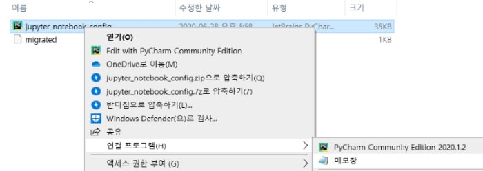 환경설정 파일이 생성된 경로를 나타낸다. 필자의 노트북에서 해당 경로를 따라가 폴더를 열어보면 jupyter_notebook_config.py 가 있는 것을 볼 수 있다. 이 파일에서 #c.NotebookApp.notebook_dir= '' 문장을 수정해야 한다.