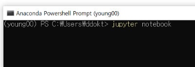 설정을 완료되면 프롬프트 창에서 주피터 노트북을 실행시키면 주피터 노트북의 홈화면이 변경된 것을 볼 숭 있다. 주피터 노트북을 실행시키는 화면과 변경된 주피터노트북 홈화면은 아래와 같다.