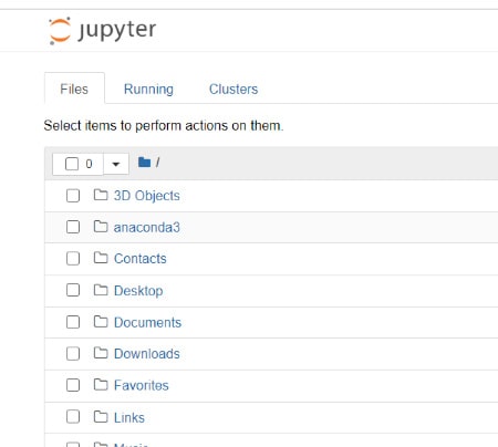주피터 노트북 홈 화면이 깨끗이 비워져 있는 것을 볼 수 있다. 시작메뉴에서 주피터 노트북을 실행한다면 아래를 계속 진행한다.
